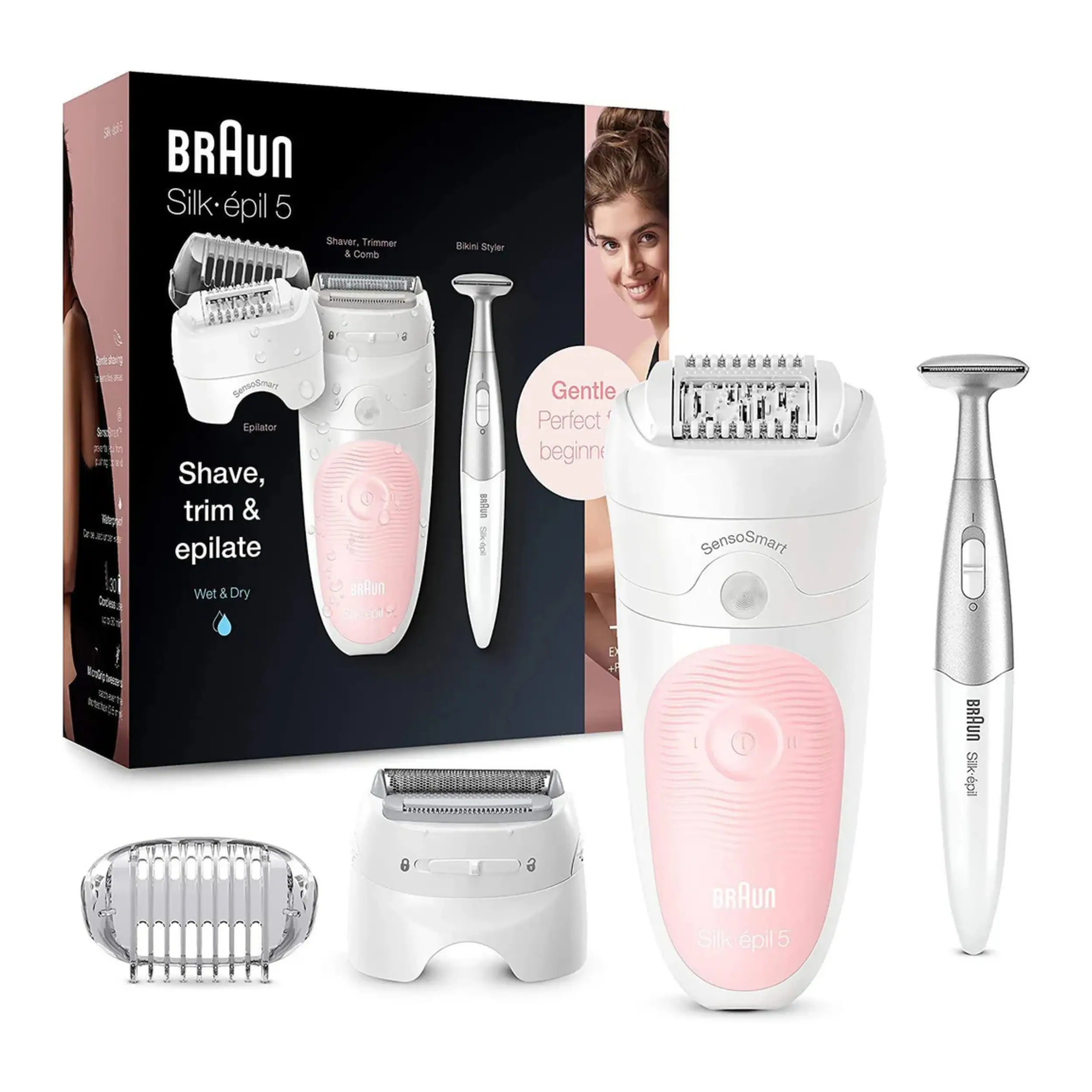 This Wet & Dry epilator can be used in the bath or shower for extra comfort and reduced discomfort. The set includes a precision Bikini Styler for clean shaping and detailing, giving you a complete hair-removal solution at home.