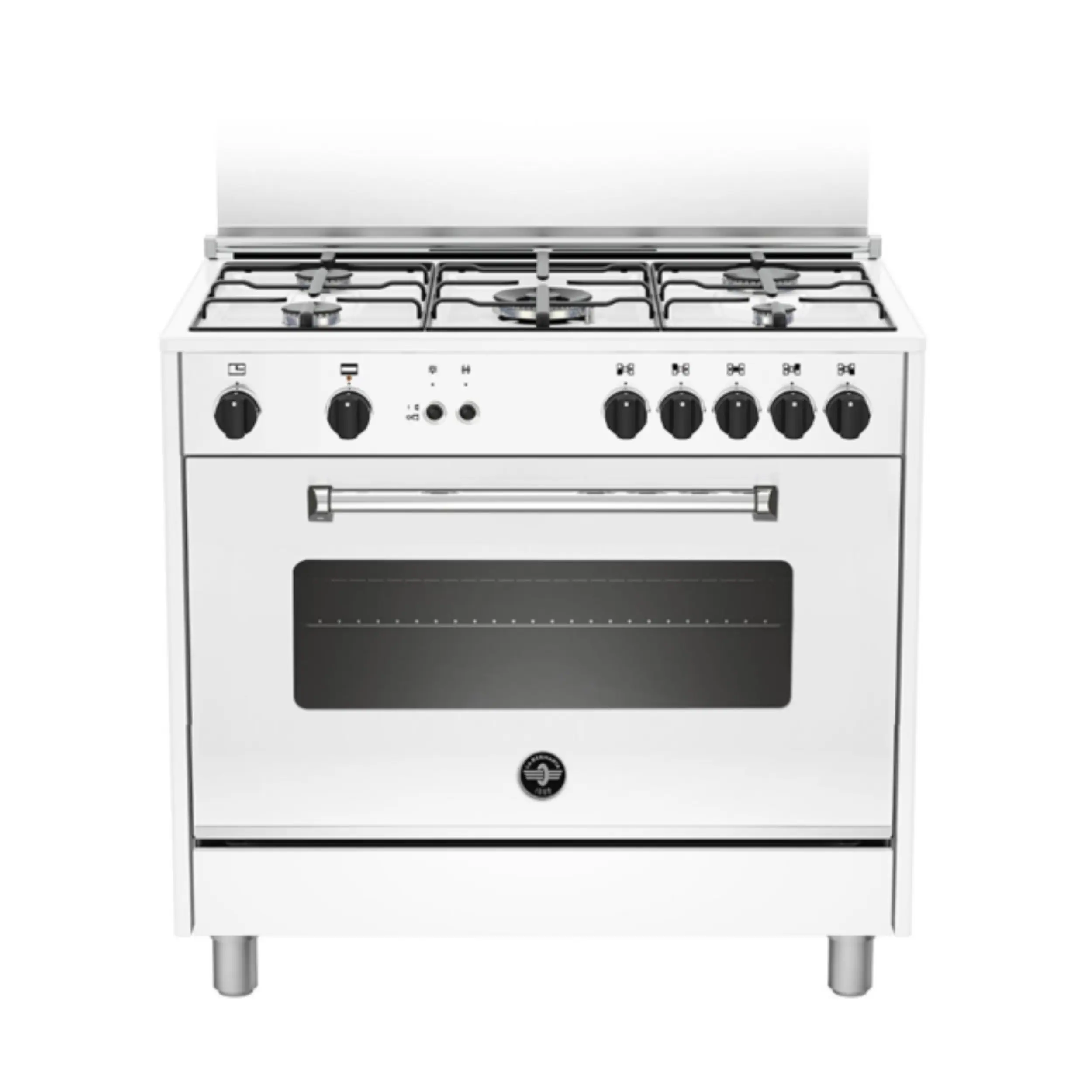 The La Germania AMS95C81CW from the Americana Series is a premium 90 cm full-size gas cooker designed for families who need performance, durability, and a modern aesthetic. Featuring a wide 142-liter oven, this model is built for serious cooking—perfect for large meals, gatherings, and Lebanese home kitchens that demand space and reliability.