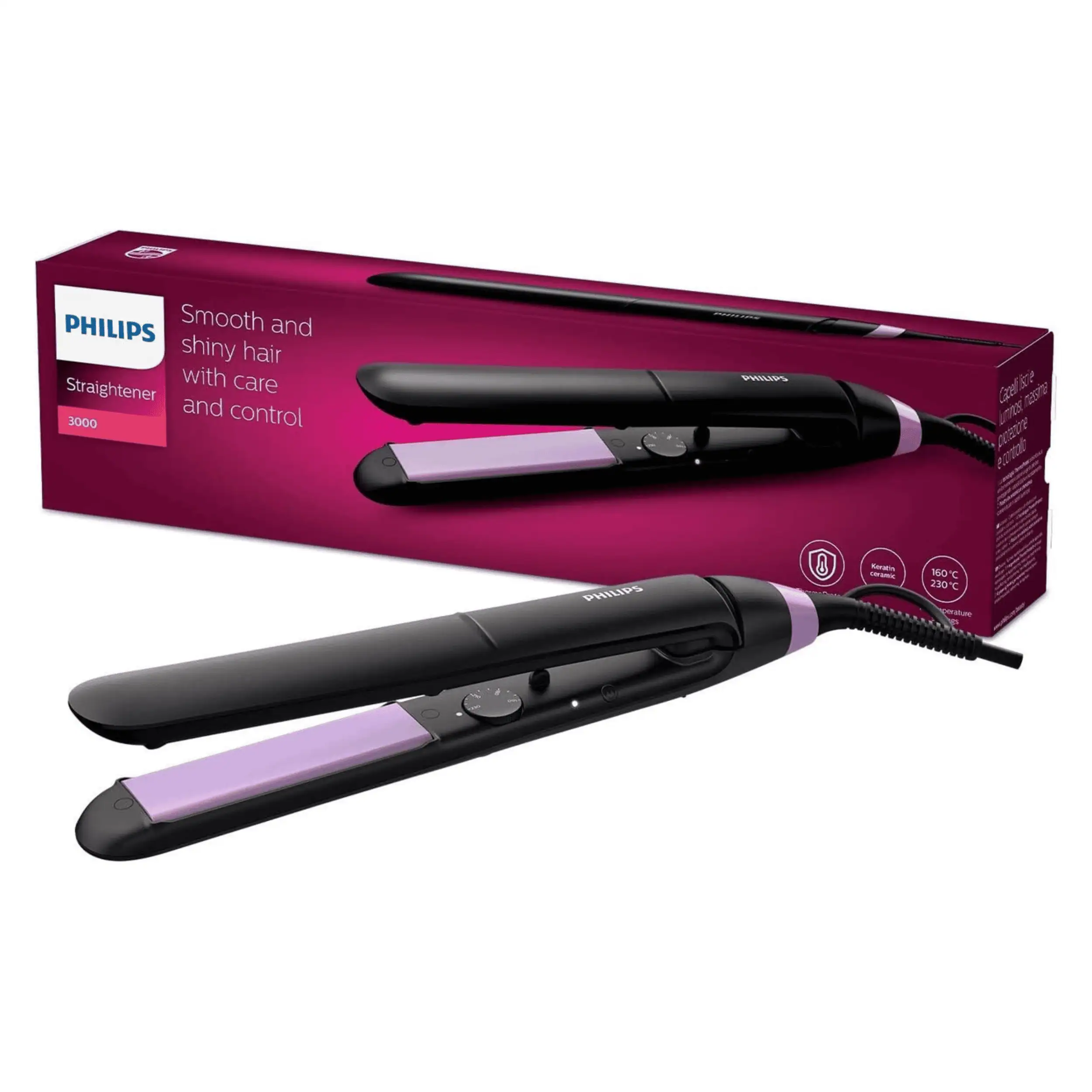 The Philips Hair Straightener BHS377 delivers fast, smooth, and salon-quality styling for all hair types. Designed with advanced ThermoProtect technology, it maintains even heat distribution to protect your hair from overheating while giving you perfectly sleek results at up to 230°C.